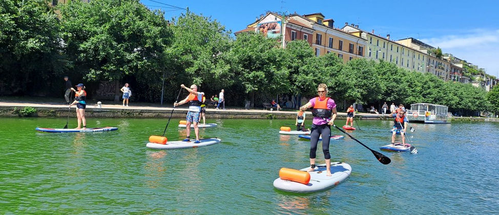 Per scoprire un quartiere storico di Milano osservando la città da un'altra prospettiva pagaiando a ritmo lento sul SUP.